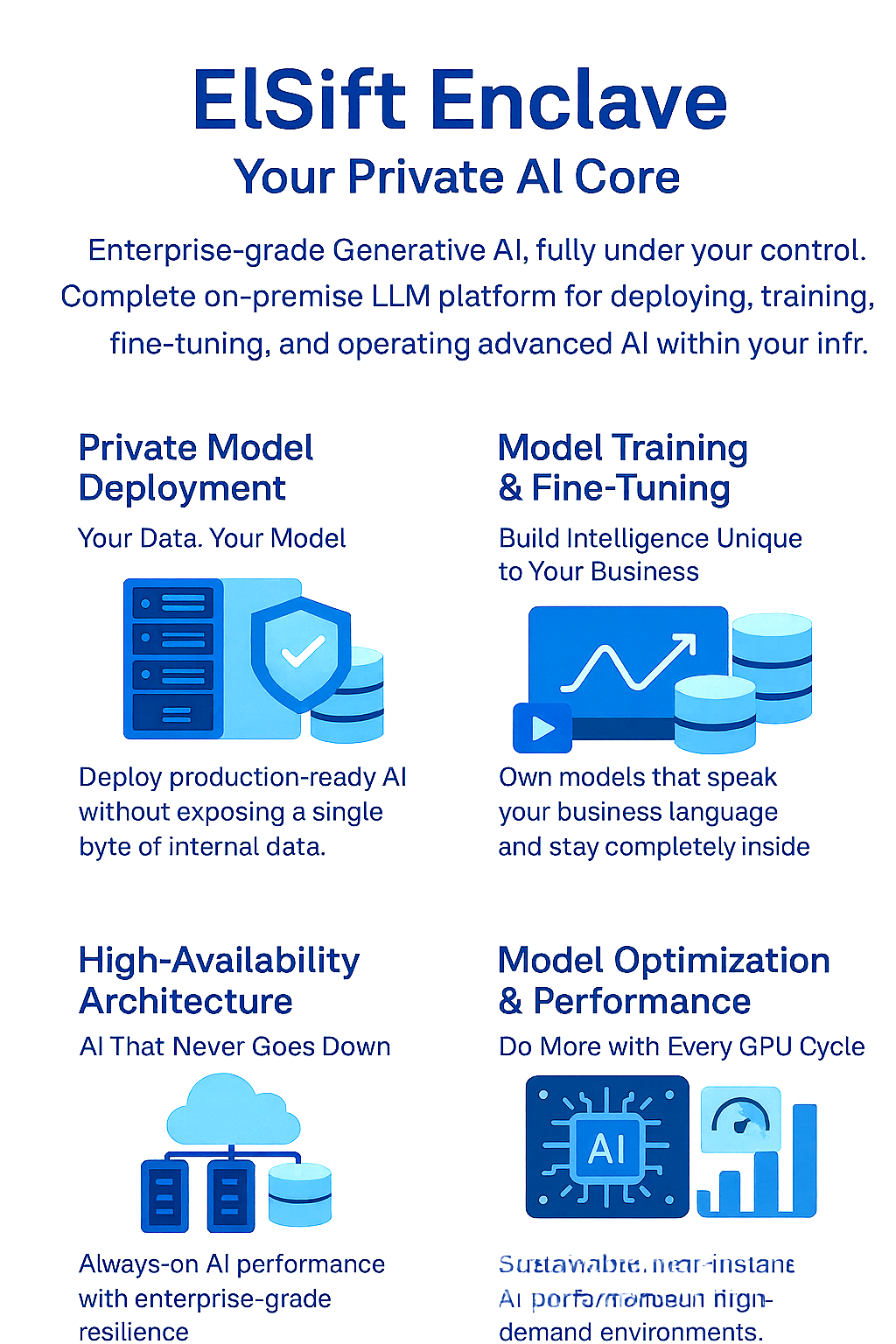 ElSift Enclave is a complete on-premise Large Language Model (LLM) platform that lets enterprises deploy, train, fine-tune, and operate advanced AI entirely inside their own infrastructure.