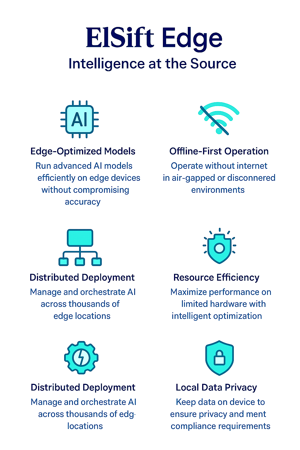 ElSift Edge brings the power of generative AI directly to your field operations, retail floors, local servers, kiosks, and edge devices enabling real-time decision-making, ultra-low latency, and complete offline capability. With ElSift Edge, your AI doesn’t rely on the cloud it lives where your data is created, ensuring privacy, speed, and resilience even in disconnected or secure environments.